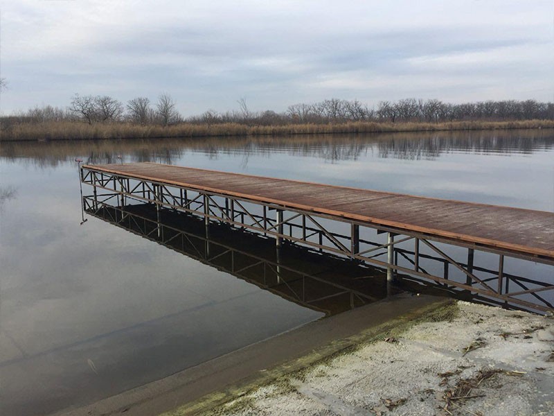 При установке фундамента причала на водоёме с неровным дном используются сваи разной длины. Это делается, чтобы выровнять уровень свайного поля.
